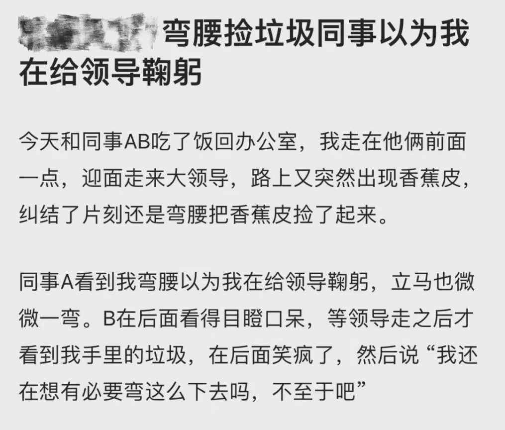 弯腰捡垃圾被同事误以为给领导鞠躬。